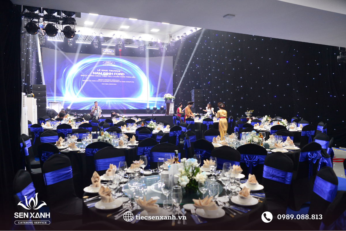 Toàn bộ bàn tiệc được phủ khăn xanh dương, khăn trải bàn trắng, phối hợp cùng đa dạng các loại hoa nhiều màu sắc và phụ kiện trang trí sang trọng. Backdrop khu vực tiệc mang biểu tượng chữ “Vinfast” đặc trưng, tạo điểm nhấn thương hiệu xuyên suốt. Tiệc Sen Xanh bố trí khu vực tiệc ở sảnh phụ của showroom, nơi khách dễ dàng thưởng thức, giao lưu mà vẫn đảm bảo sự thông thoáng.